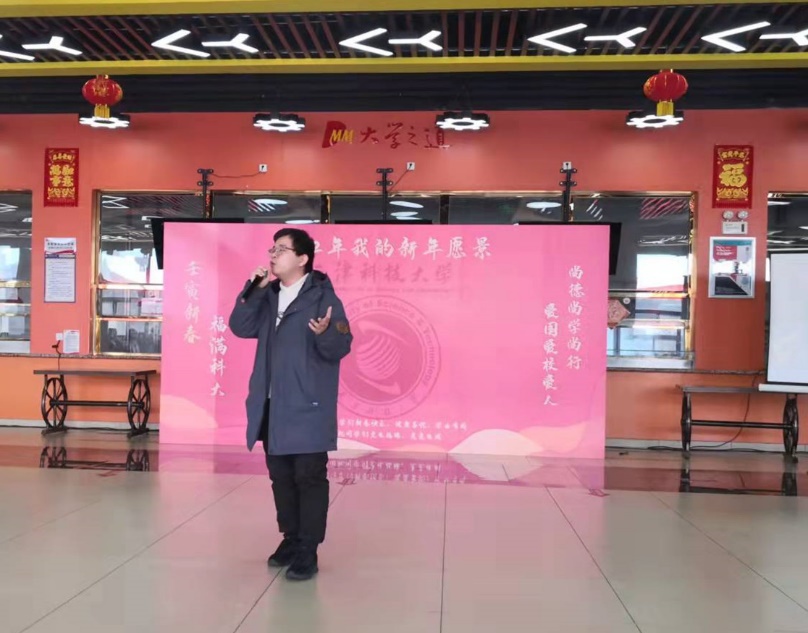 新春联欢的现场,我院21级研究生刘泽院献上一首《故乡的云》,歌喉嘹亮引人入神,求学数载,天津亦是故乡,博得现场一片热烈欢呼与掌声。