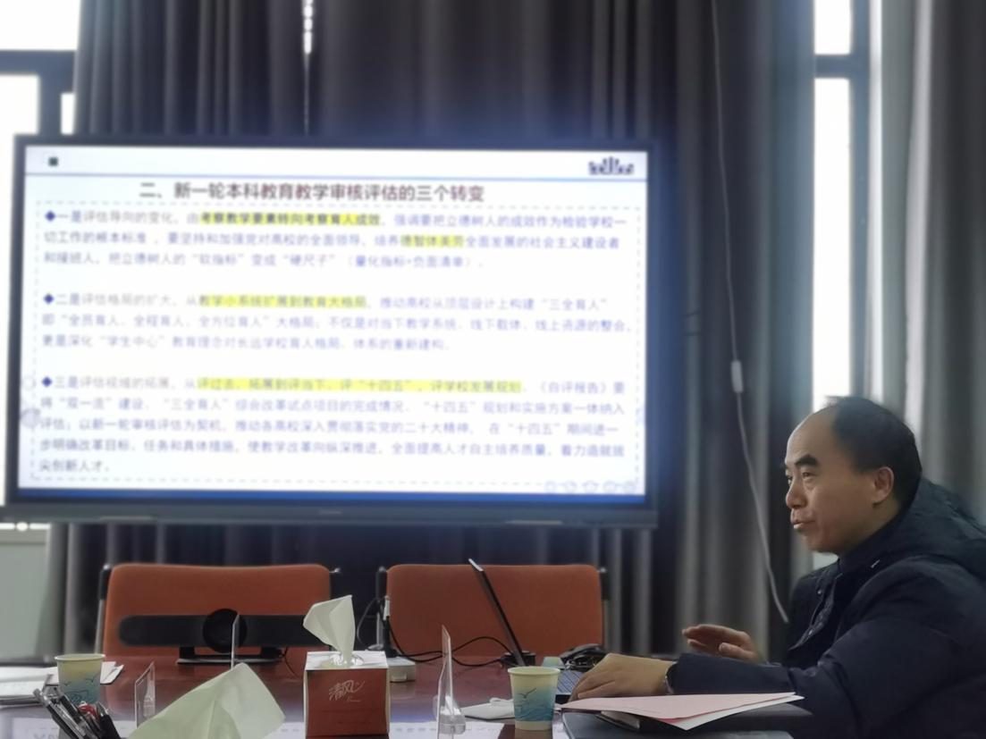 徐娜处长对于我校的基本情况和应对本轮教育教学评估的准备工作做了简要介绍,强调我校对于学术型人才培养目标的定位以及围绕这一核心目标的战略部署已经纳入学校“十四五”发展规划和重点工作中,全校将以本科教学评估为契机,树立“大教育观”,全面提升学校的教育教学水平、质量文化意识和质量保障能力。