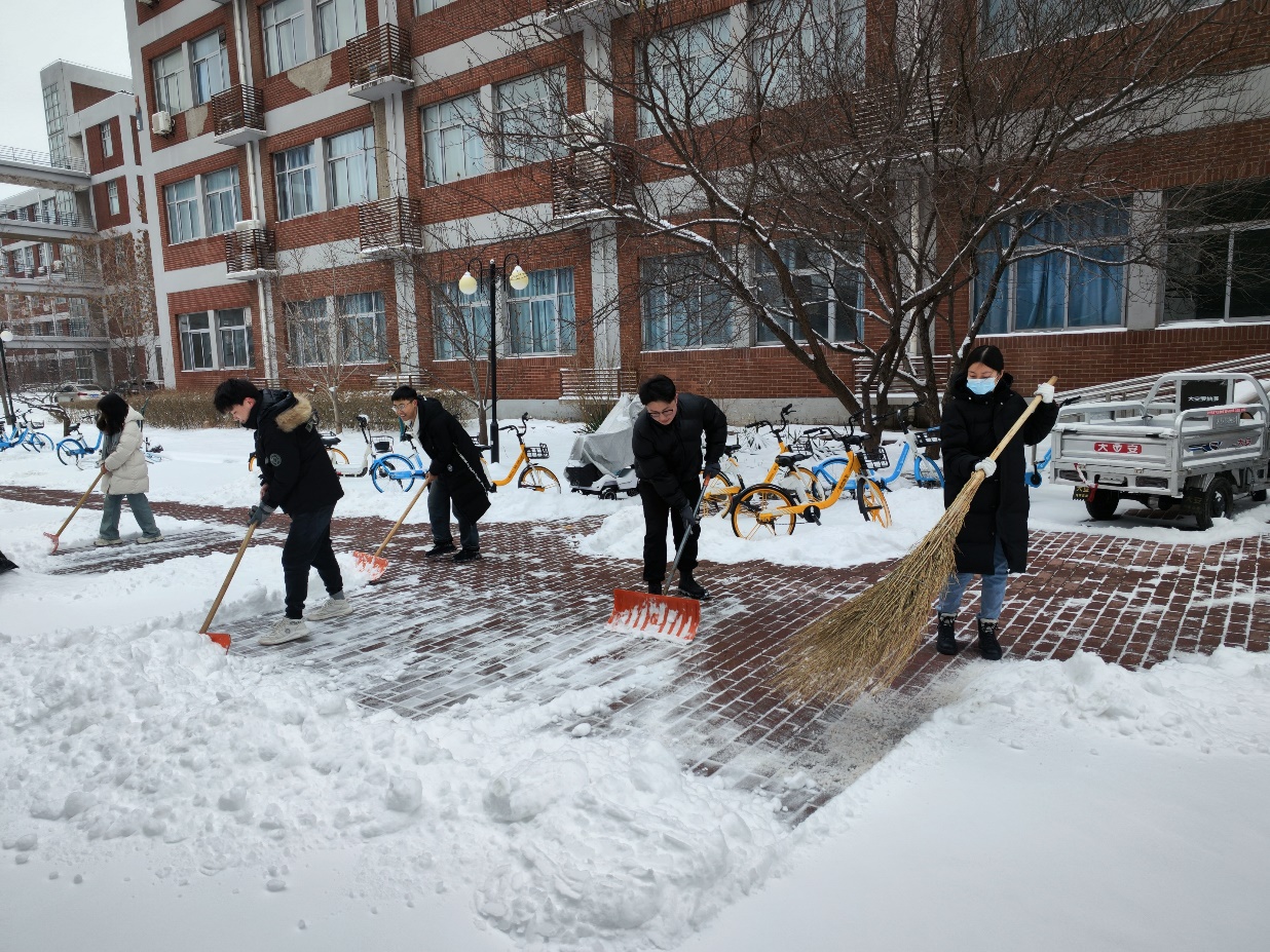 志愿者们手持铲雪工具,分成小组,有条不紊地展开了工作。他们清理了2号楼前主要道路和生物楼前的积雪,确保师生们的出行安全。