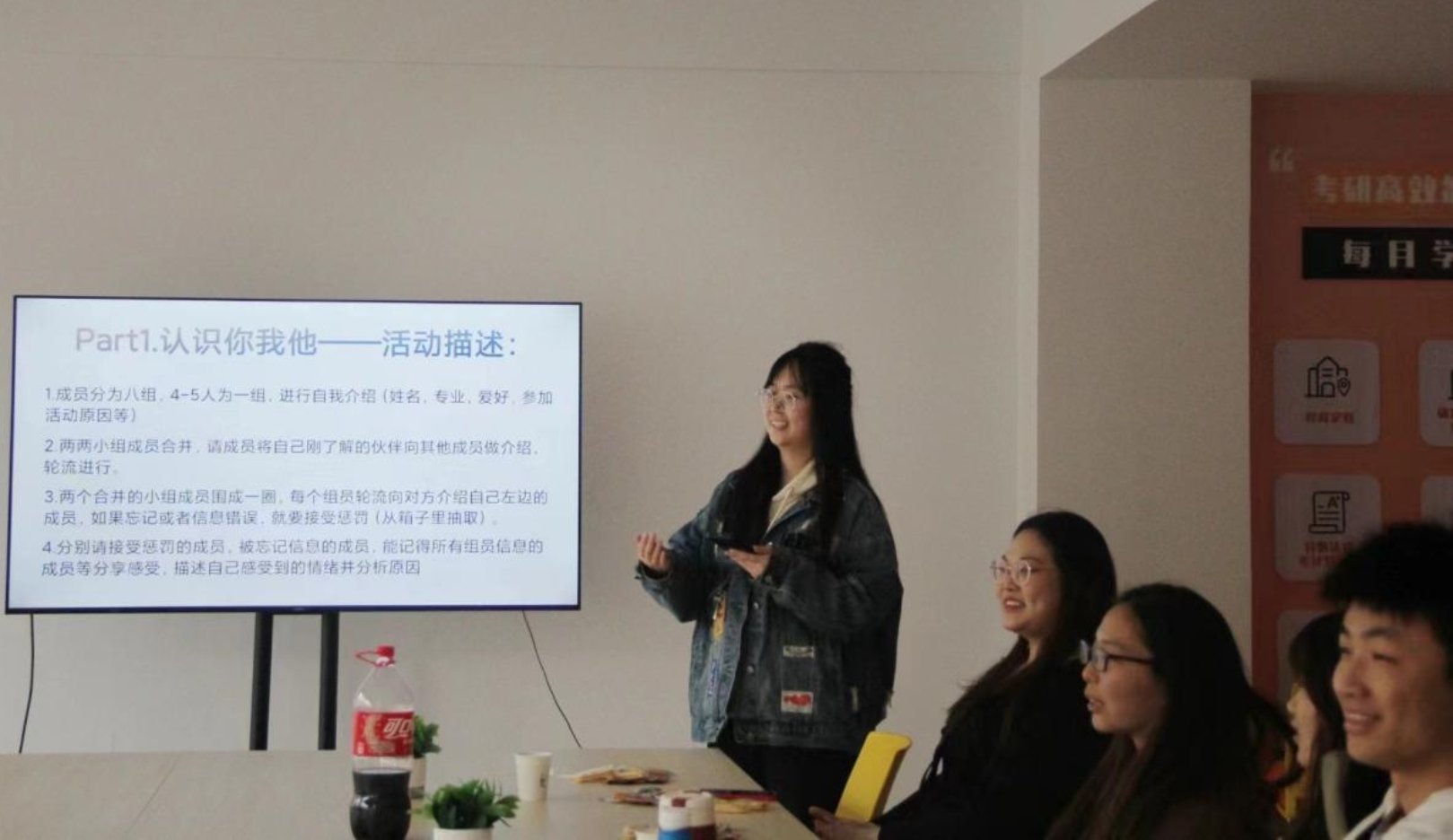 本次朋辈团体辅导活动共分为三项活动:认识你我他、你画我猜、放松体验“腹式呼吸”法。在认识你我他环节中,同学们两两组成小组,轮流进行自我介绍,并伴随着复述和惩罚,引导学生感受初识过程中的情绪变化;之后,同学们开展了趣味的你画我猜游戏,在团结协作与头脑风暴中,同学们感受到情绪的波折变化;最后,全体同学静心“腹式呼吸”冥想,倾听音乐、调整呼吸、平复情绪,同学们面对着小组的伙伴,勇敢地说出自己内心的真实感受,让情感自由的流动,让自己的成功经验自然的流淌,在通力合作下,同学们的内心逐渐被激活。