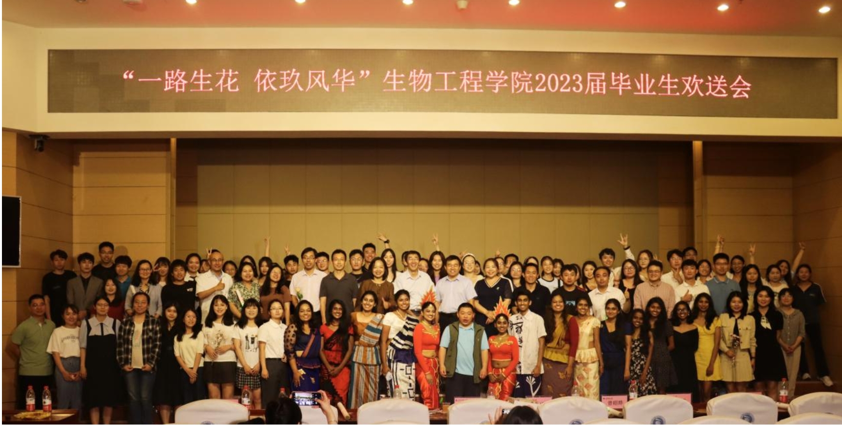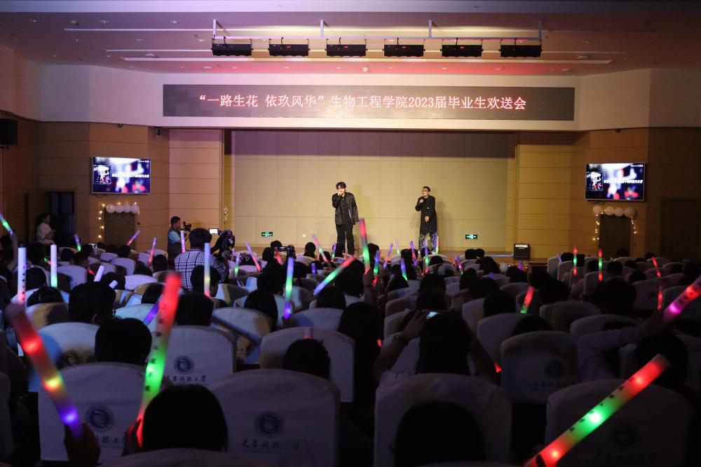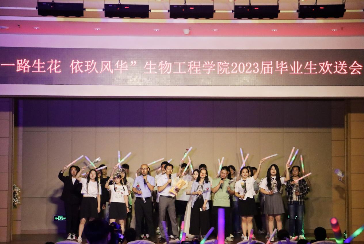 本届欢送会以“一路生花 依玖芳华”为主题,共分为“紫藤花下,少年笙歌”、“少年锦时,不负韶华”、“知命不惧,日日自新”和“星河为路,此去乘风”四个篇章。晚会伊始,播放由学院领导老师送别2023届毕业生特别制作的寄语视频,老师们用谆谆教诲共同祝福学生们在人生新的征程上,保持前进,不负青春;一首《第一天》正式拉开晚会帷幕,唱响悦耳动听的青春旋律;《阿刁》歌声悠扬,小品《如此队友》和歌曲《不再犹豫》,展示着团队合作的重要性和生命活力,笛子串烧《不愁+无羁+青花瓷》勾起了大家对大学生活的无尽回忆,歌曲《心墙》、《海阔天空》、串烧《再见+放心去飞》再次点燃全场,响起雷鸣般的掌声,留学生歌舞节目《Srilankan cultural songs with traditional dance》更是惟妙惟肖,向大家表达了来自异乡的毕业祝福,全体辅导员老师带来的歌曲《明天会更好》将最真挚美好的祝福送给本届毕业生。整场晚会在190411班演唱的歌曲《这世界那么多人》中拉下帷幕。