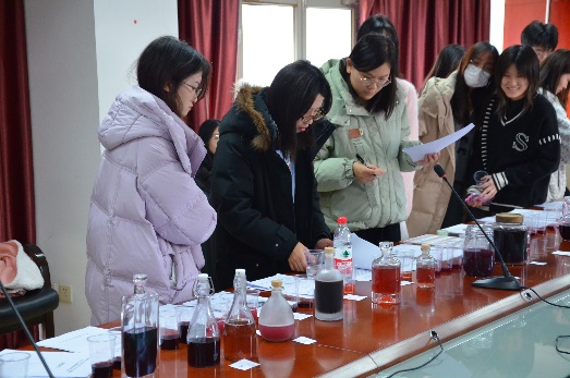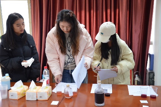 一张张摆放整齐的桌面上,陈列着参赛选手们精心酿制的葡萄酒以及详细记录着酿造过程与创意的申报书。在品尝打分环节,评委老师张健、黄琳、袁林秉持着严谨、认真、负责的态度,有条不紊地逐一品鉴每一份参赛作品。他们凭借着专业的知识和敏锐的感官,从气味的芬芳馥郁、颜色的纯正度与层次感、口感的醇厚圆润以及申报书的详实规范等多个维度进行细致入微的评分。