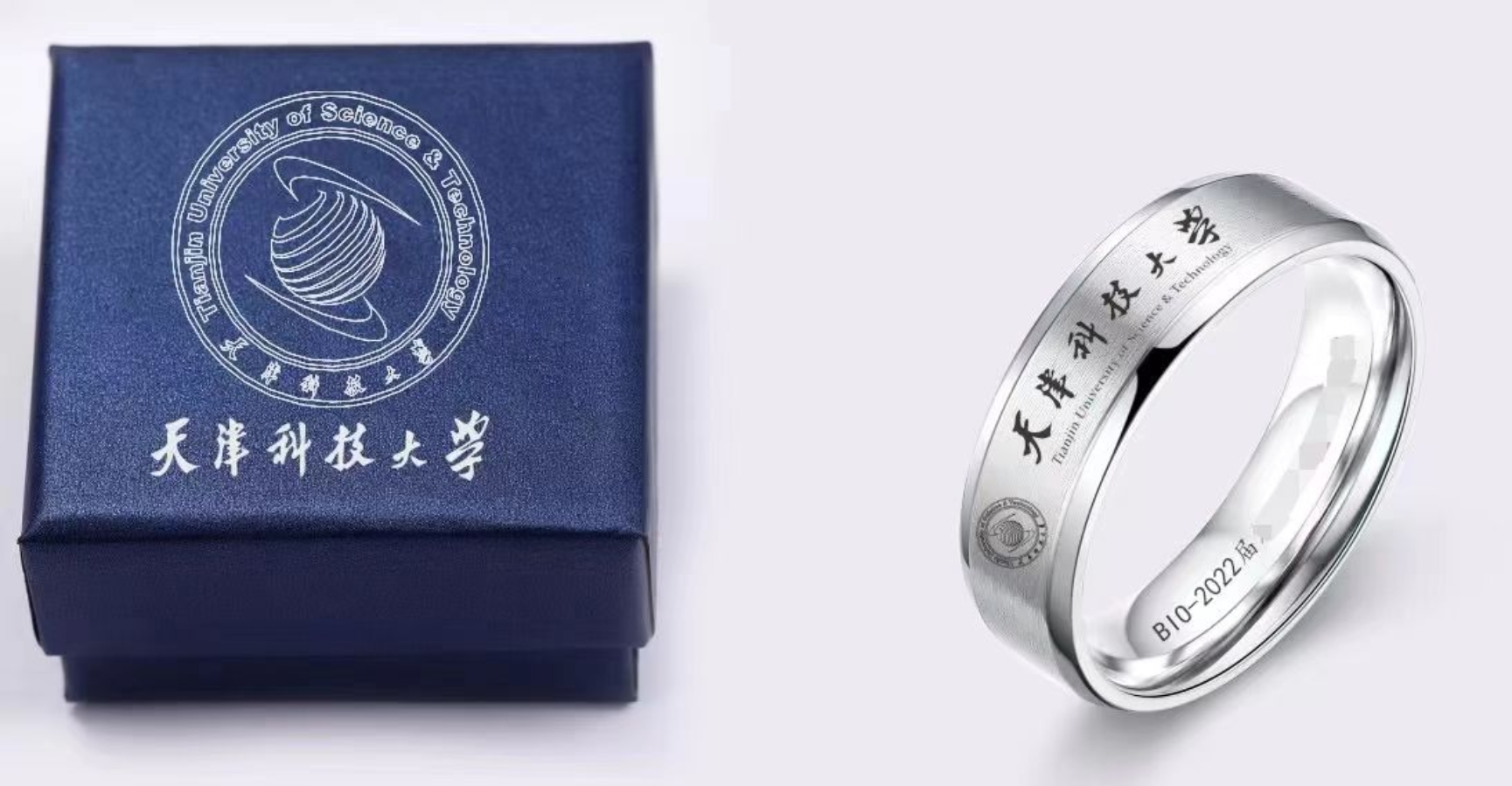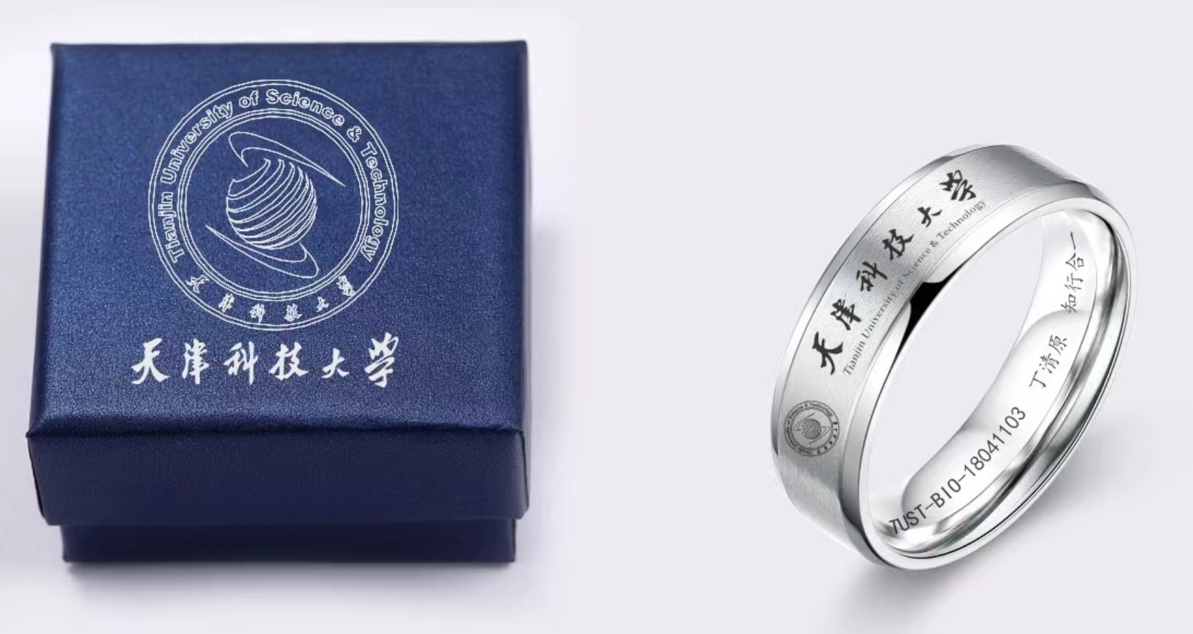 字样,里圈刻上了“TUST-BIO-学号姓名”和学院院训“知行合一,至善求是”,让戒指成为独一无二礼物。戒指给全部同学配了礼盒和挂绳,可搭配挂绳作为胸前吊坠,提醒自己要永葆赤子之心。此外,学院为135名未在校的毕业生安排了戒指寄送服务,将毕业戒指蕴含的美好祝福快递到每一位毕业生手里。