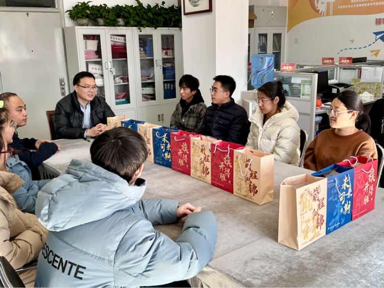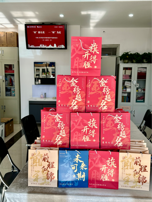 活动现场,学院领导与老师们亲手将一份份精心准备的“考研加油包”递到同学们手中。“考研加油包”内装有水果、书签、文件袋、明信片等实用物品,橙子寓意“心想事成”,愿同学们在考场挥洒自如。书签上的寄语,承载着“金榜题名”的祝福。这些小小的礼物,是学院对考研学子点滴付出的认可,更是对大家未来辉煌的期许。
