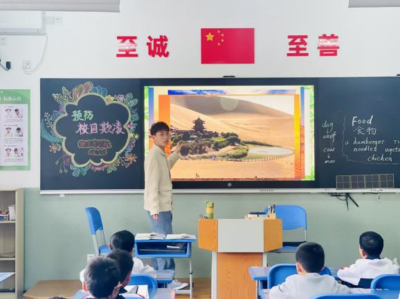 课后服务志愿者2022级本科生张卓然、刘恩泽从沙漠中生存的生物开始介绍,先后介绍了沙漠环境、沙漠动物的生活方式、沙漠植物的生长方式,倡导同学们保护环境,保护自然界中的动物和植物。另外,志愿者还介绍了“基因”、“性状”、“遗传”等生物学科专有名词,让小学生们对生物学知识有初步的了解。