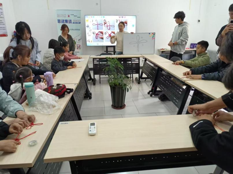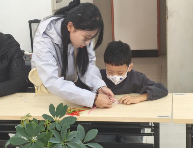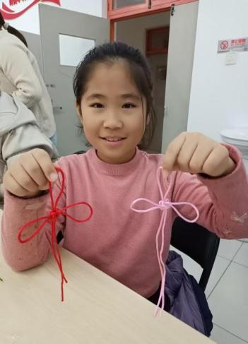 宣讲进入互动环节时,“吉祥中国结手工”模块与弘扬传统文化主题相呼应:青少年们跟着志愿者的步骤,用红绳编出盘长结的基础结形,再搭配金色挂坠点缀出喜庆质感,亲手完成寓意“福寿绵长”的中国结作品。这让“绳结寄情”的文化内涵在动手过程中变得鲜活,进一步加深了大家对传统民俗工艺的感知。