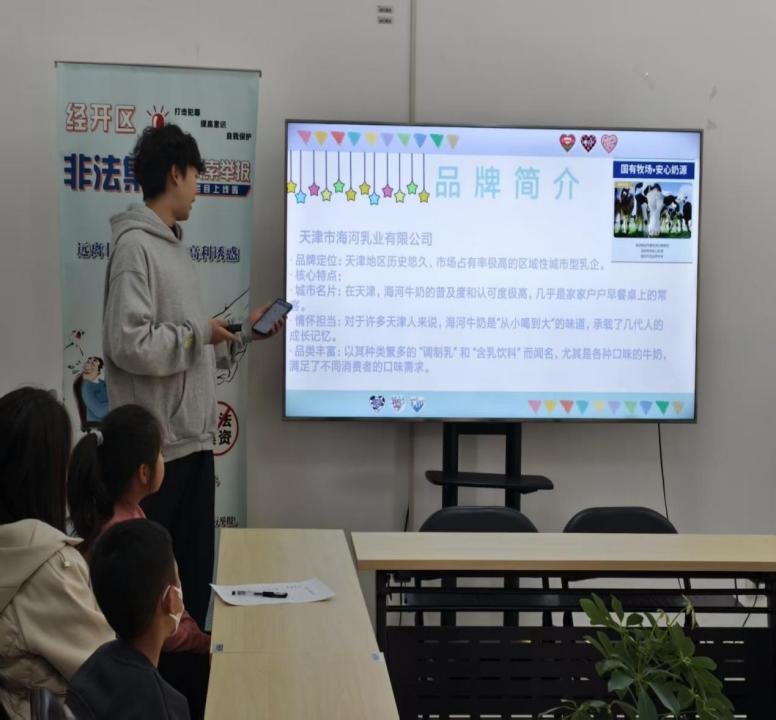 青蒲青年志愿者协会宣讲团成员赵李超系统讲解了从海河牛奶的创新开发到背后体现出来的天津工业的发展。活动中,赵李超从津派文化视角出发,向孩子们生动阐释了天津本土乳业的发展历程。通过展示海河乳业从早期作坊式生产到现代化生产的变迁过程,孩子们了解到这家老字号企业如何与天津这座城市共同成长。在津派文化注重务实创新、兼容并蓄的特质影响下,海河乳业既保留了传统工艺精髓,又不断推进技术革新,其发展轨迹正是天津工业文明演进的一个生动缩影。这一独特的文化视角,让孩子们对家乡企业的发展历程产生了更浓厚的兴趣。