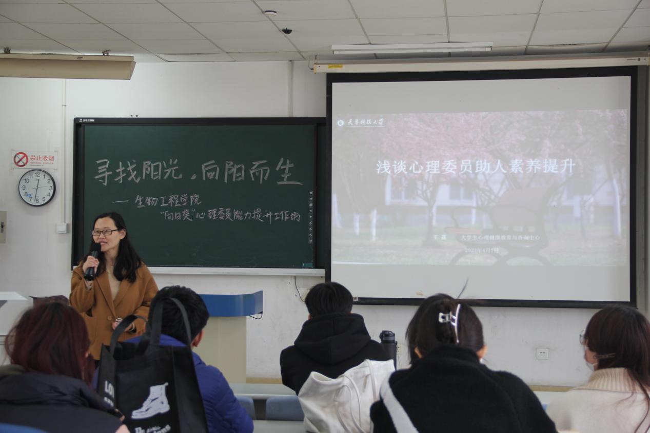于滨海中校区3号楼209教室举行了以“浅谈心理委员的助人素养提升”为主题的心理委员能力提升培训讲座,学校大学生心理健康教育与咨询中心王荔老师受邀主讲,小妲己直播