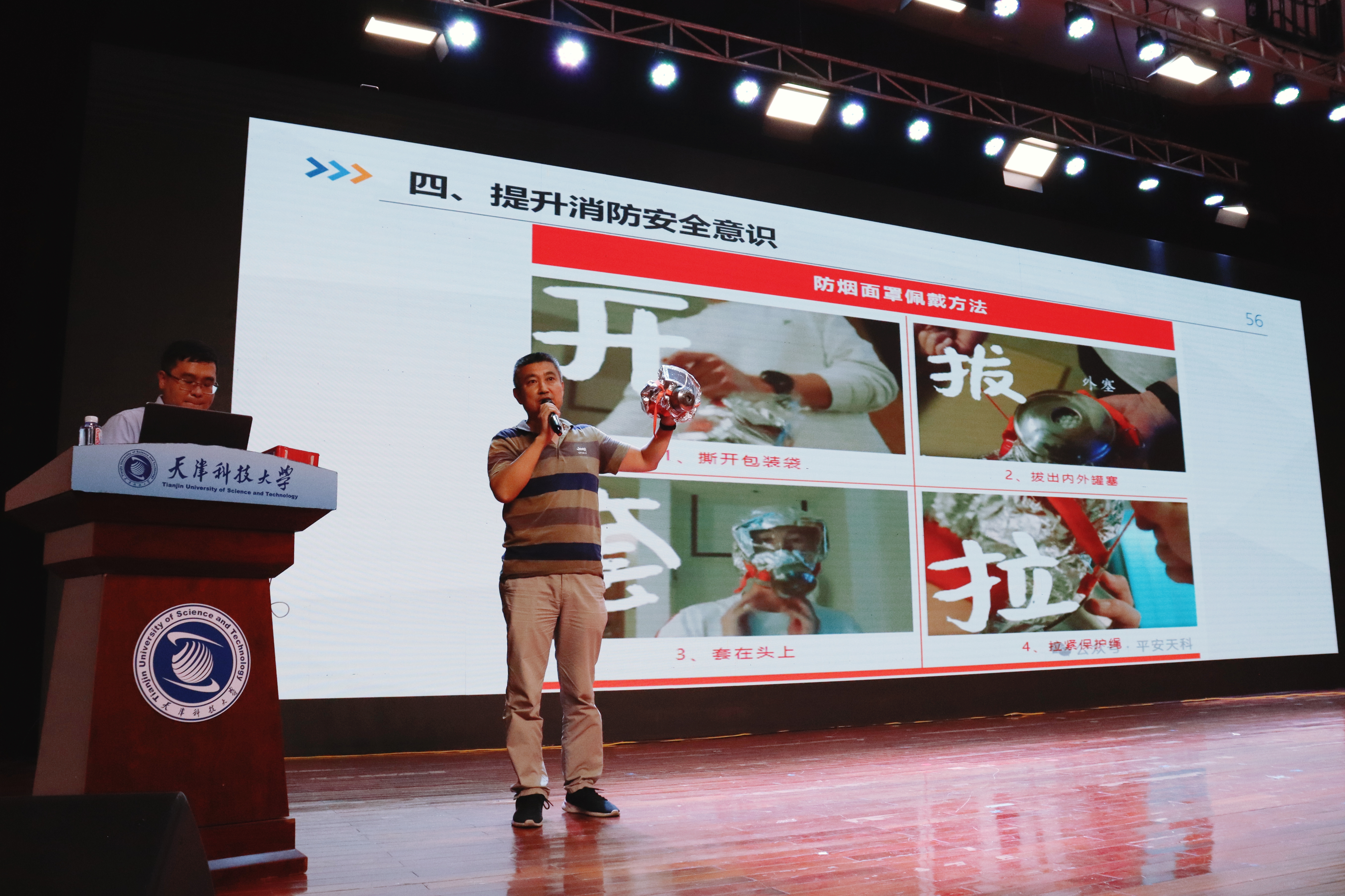 学院邀请了保卫处王悦科长带来一场生动详实的消防安全教育讲座。他结合高校实验室火灾案例,深入剖析火灾发生的原因及危害,详细讲解了灭火器、消防栓等消防设施的使用方法以及火灾预防措施。保卫处孙家平老师现场示范了“过滤式消防自救呼吸器”和灭火毯的使用方法。两位老师通过现场演示与互动问答,强化了同学们的安全意识,直观掌握火灾逃生技巧,有效提升了大家应对突发火情的能力。