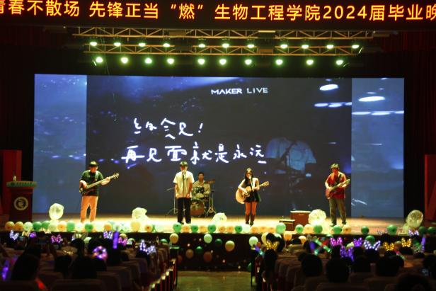 之后,stop lake乐队的《yellow》、吕姗和郑又铭的合唱《凉凉》以及汪楚杰同学的《今夜无人入睡》等节目为观众们带来了一场摇滚、流行、美声的听觉盛宴。2024届生物工程实验班带来《你要跳舞吗》和生工第一学生社区制药工程本科生党支部的《我们的明天》等歌曲串烧展现了毕业生们的青春活力。小妲己直播