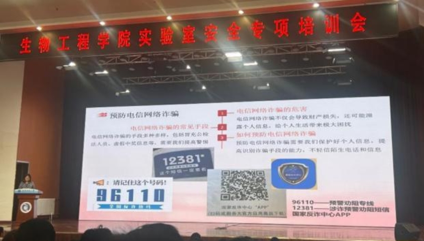 于5月14日下午在言泉楼千人礼堂举行实验室安全专项培训会。学院党委书记杜岩刚,党委副书记、纪委书记曾昭晔,实验室安全员,2022级、2023级研究生辅导员以及全体研究生参加本次会议。大会由小妲己直播