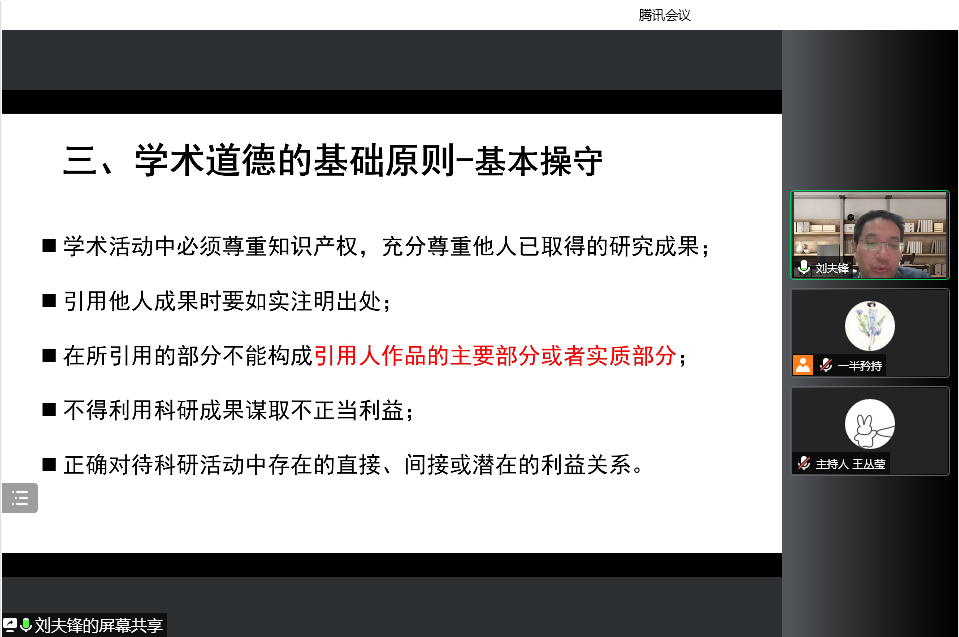 尊重知识产权,充分尊重他人成果,在讲座结束后刘老师与在线同学们进行互动交流,就同学们提出的一些难以甄别的学术规范问题进行详尽解答。