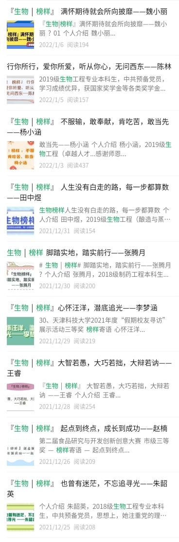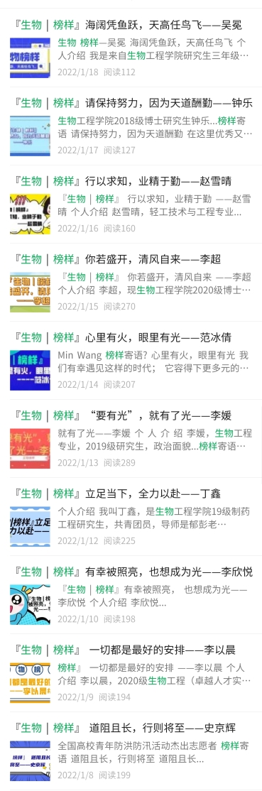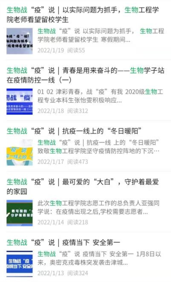 自疫情发生以来,学院先后面向全院学生开展榜样教育、安全教育、防诈骗教育、职业规划、心理疏导等系列教育活动,放假不放松,始终将对学生的陪伴、守护和引导放在第一位。20余篇身边的榜样事迹,纵向覆盖大一至研三,篇篇可参考,件件可学习;生物战“疫”说系列推文,将安全教育、防诈骗教育、身边的志愿者事迹广而告之,引导学生提高安全意识、自我防护意识,也鼓励学生主动抗“疫”、承担责任、发光发热。