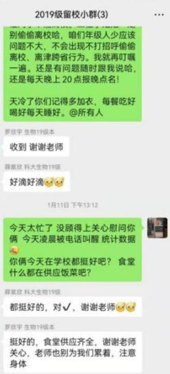 学院特别为留校学生开展谈心谈话、解疑释惑工作。针对学院寒假留校学生基数大的实际情况,成立了以党委为领导的留校学生管理工作小组,深入学生宿舍开展调研,了解同学们留校期间的身心状况、科研情况及生活困难,把解决思想问题、心理问题与解决实际问题紧密结合,学生反馈的相关问题已得到极大改善;2018级本科生辅导员申莉面向留校学生开展8次集体辅导和单独谈心谈话,辅导内容围绕合理规划留校时间、前置毕业设计/论文安排、生涯规划、求职等方面,并对申请留校的10名本科生进行“云家访”,创建留校学生家长微信交流群,随时与学生和家长进行沟通,让留校学生放心,让留校学生家长放心;针对留校的斯里兰卡留学生,通过“结对子”,对留学生进行精准帮扶,帮学生解决语言沟通、无身份证登记核酸检测信息等问题。
