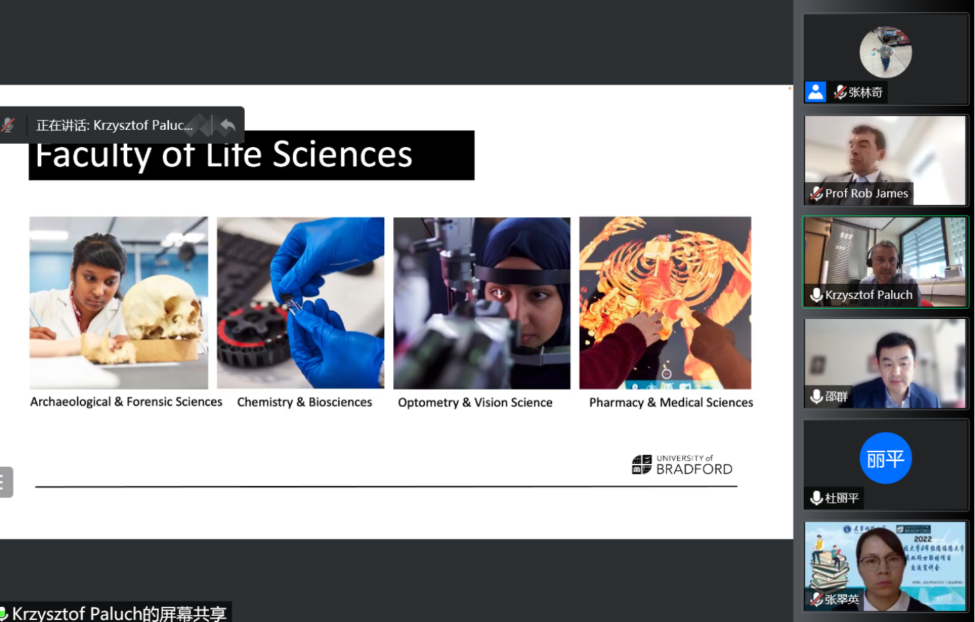 与布拉德福德大学硕士双学位联合培养项目举办2022年线上交流宣讲会。英国布拉德福德大学生命科学学院院长Rob James、副院长Mohammad Isreb、副院长Krzysztof Paluch和该校开放式创新中心副主任邵群、中国办公室副主任宋峥,我校国际交流处副处长赵佩钦、研究生院副院长万丽丽、小妲己直播