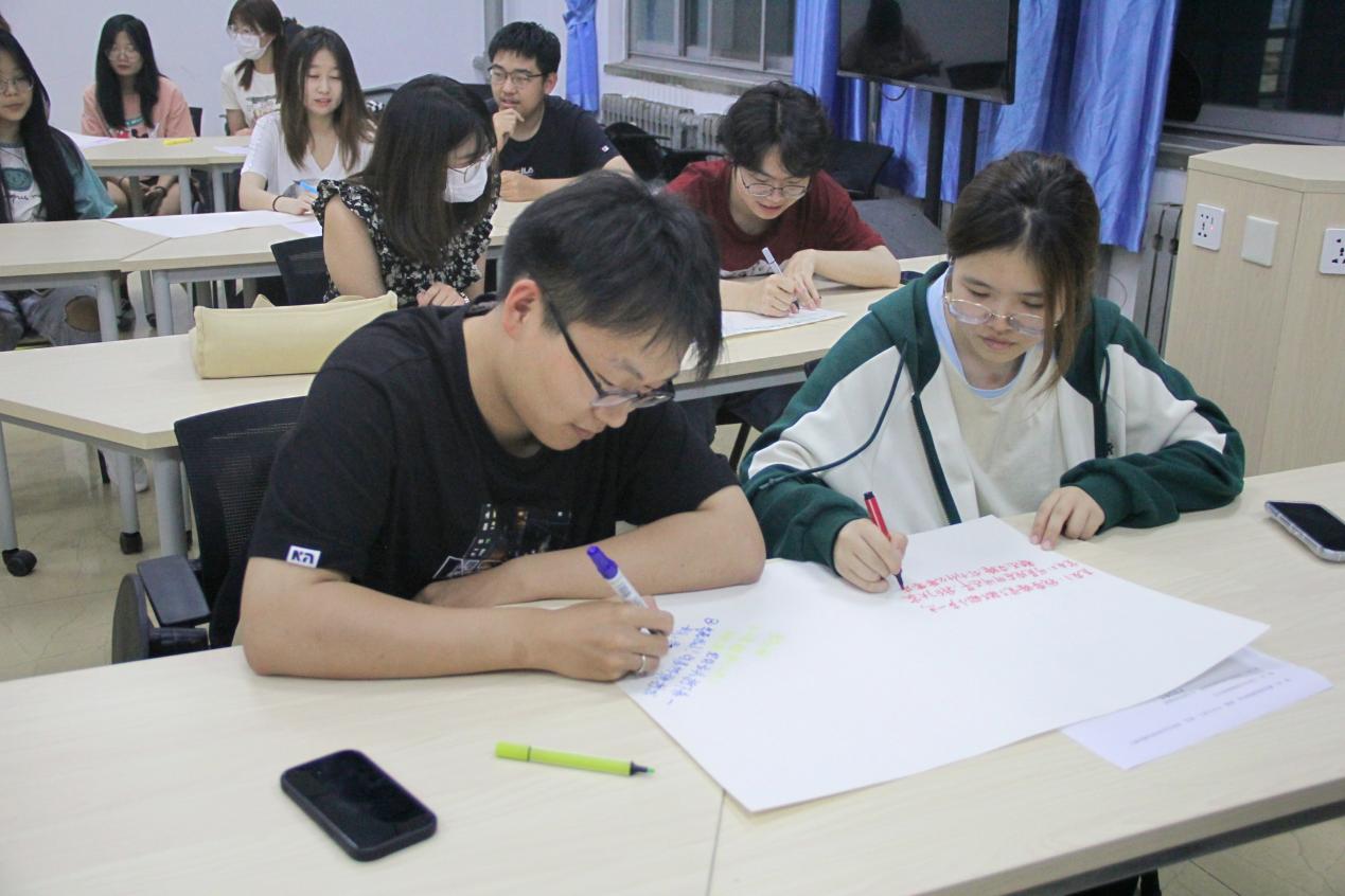 之后,参照冰山理论的分析思路,全体心理委员们分小组开展讨论。围绕生活中常见的亲子、朋友、同学、恋人沟通实例,探索例子中情绪、行为背后的秘密,并总结归纳人与人沟通原则,明确冰山之上的行为与冰山之下的内在信息一致,才可以达到有效沟通和一致性沟通。